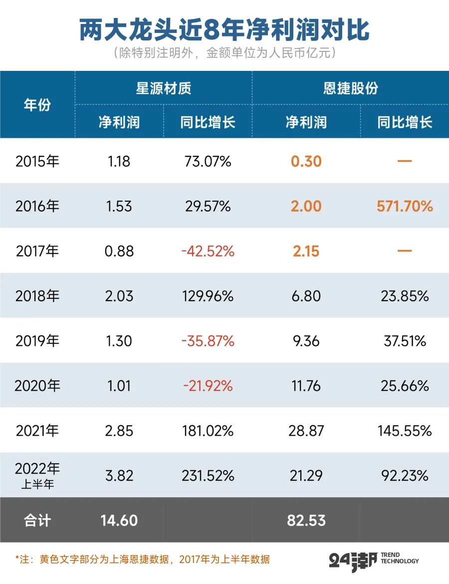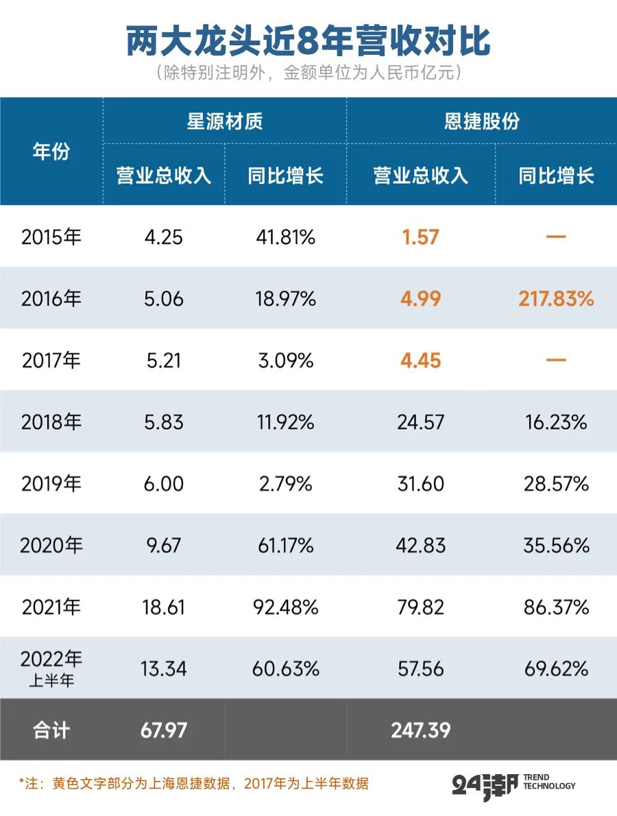 整体来看,2015年-2022年上半年期间星源材质合计创收67.97亿元,而恩捷股份合计创收超250亿元,前者仅为后者的27.19%,仅在营收层面看,两者似乎已经不再是同一重量级对手。