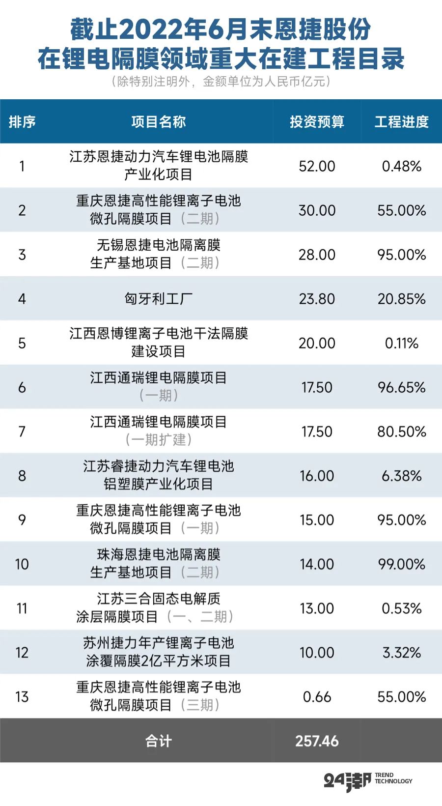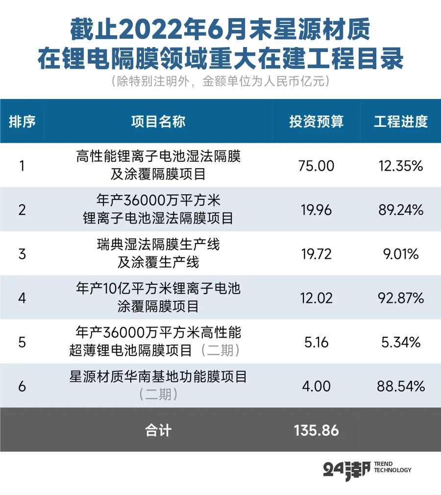 目前两者也展现了高效的战略执行力。比如据24潮统计,截止2022年6月末,恩捷股份在锂电隔膜领域有13个重大在建工程,总投资预算为257.46亿元,星源材质拥有6个重大在建工程,总投资预算为135.86亿元。