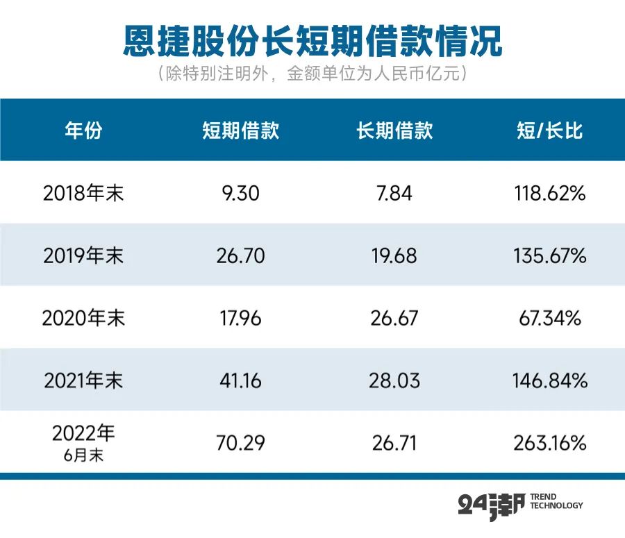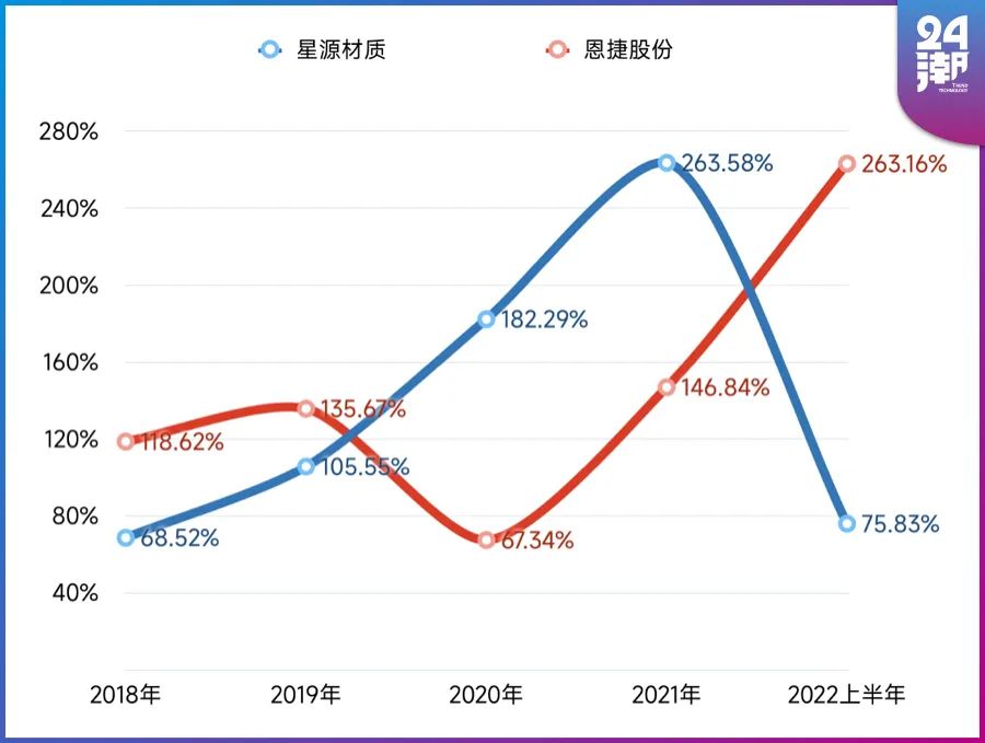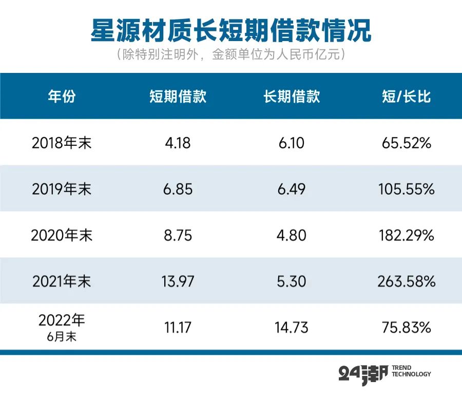 财报显示:2019-2021年、2022年上半年,星源材质的现金到期债务比分别为14.37%、20.52%、23.36%、53.87%,而恩捷股份的现金到期债务比则分别为20.96%、34.97%、28.45%、6.71%。