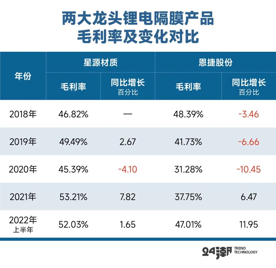 如下表所示,在2021年恩捷股份锂电隔膜产品毛利率还较星源材质高出15.46个百分点,而2022年上半年两者间毛利率差距已缩减至5.02个百分点。