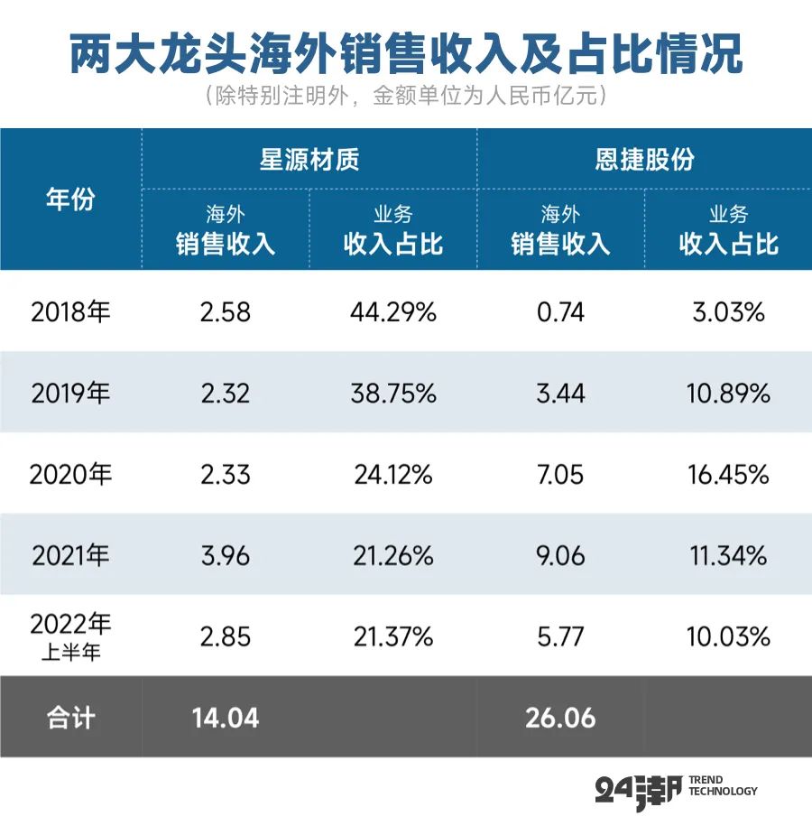 而恩捷与星源两大龙头的海外拓展却不尽如意,过去近4年间,星源材质海外收入53.49%,业务占比从2018年的44.29%降至2021年的21.26%,而恩捷股份过去4年间海外销售占比从未超过20%,2022年上半年甚至已降至10.03%。