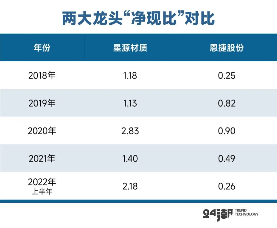 如下表所示,恩捷股份净现比一直低于1,2022年上半年更是降至0.26,而星源材质净现比达2.18,孰强孰弱一目了然。