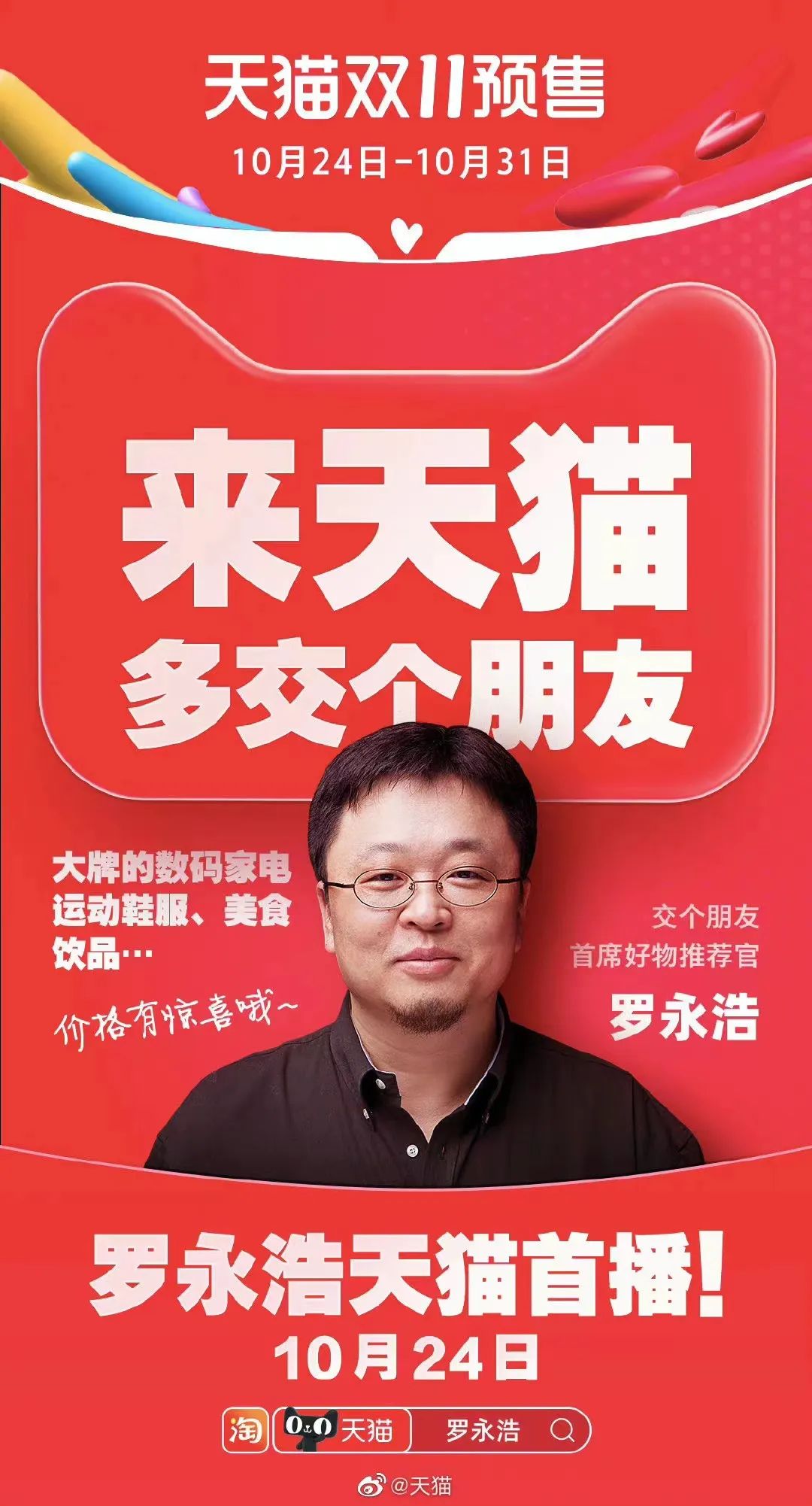 10月20日,“交个朋友”官方微博称,罗永浩将于10月24日开启淘宝直播首秀,此前亦有消息爆出,其于10月24日-11月11日期间共计有5个直播场次。