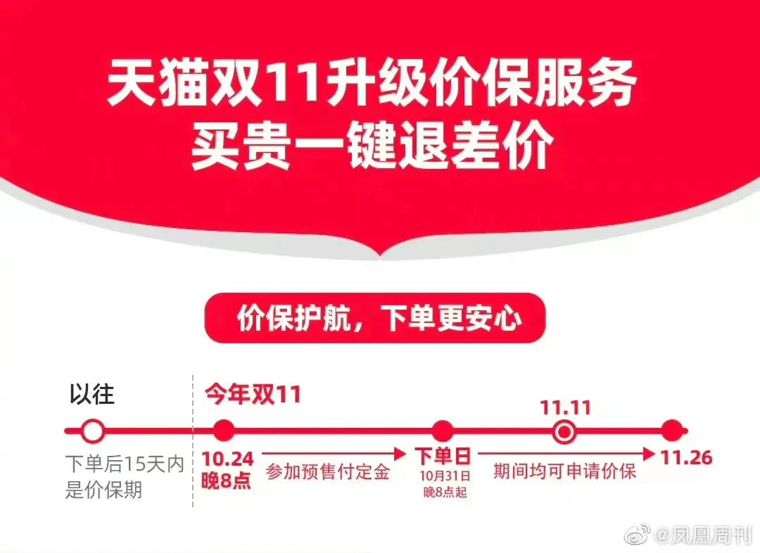 淘宝价保机制也进行全面升级,将付款后15天内价保,改为付款后至11月11日活动结束后15天内全程价保,这意味着最长价保时间将从以往15天延长至27天。