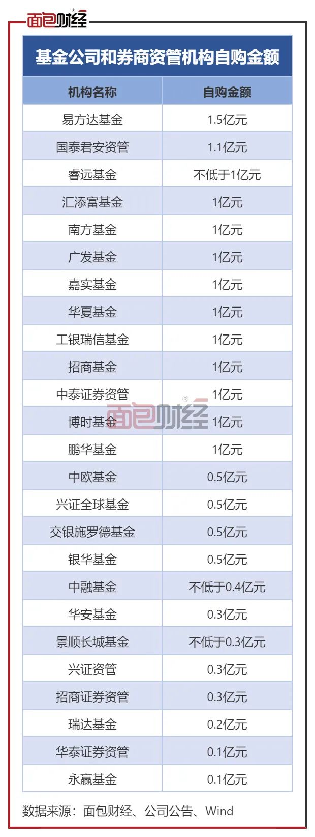 除了上述机构,南方基金、汇添富基金、广发基金、嘉实基金、华夏基金、工银瑞信基金等头部机构也将自购1亿元。