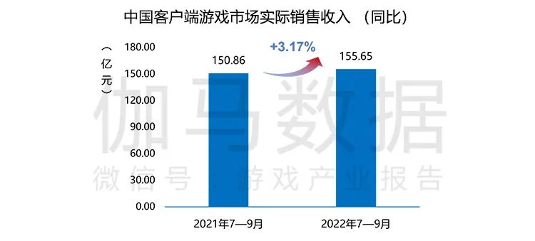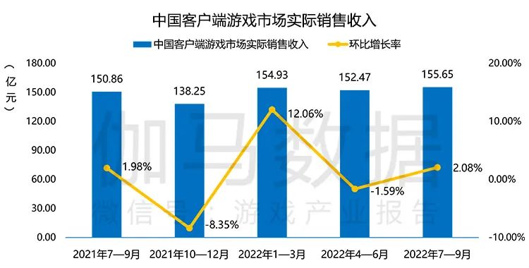 2022年7—9月,中国客户端游戏市场实际销售收入达155.65亿元,环比、同比均取得小幅增长。
