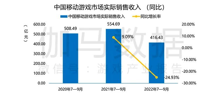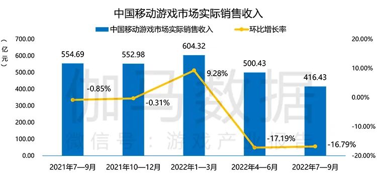 2022年7—9月,中国移动游戏市场实际销售收入416.43亿元,环比降幅较上个季度稍有减小。
