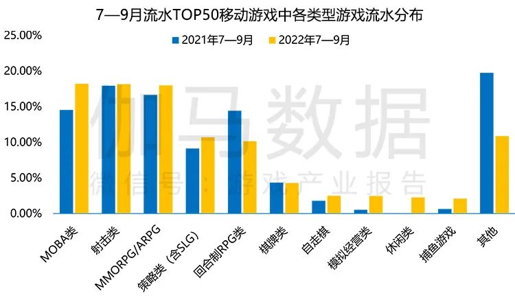 流水TOP50游戏类型分布:MOBA类流水份额增加,较去年同期新增休闲类