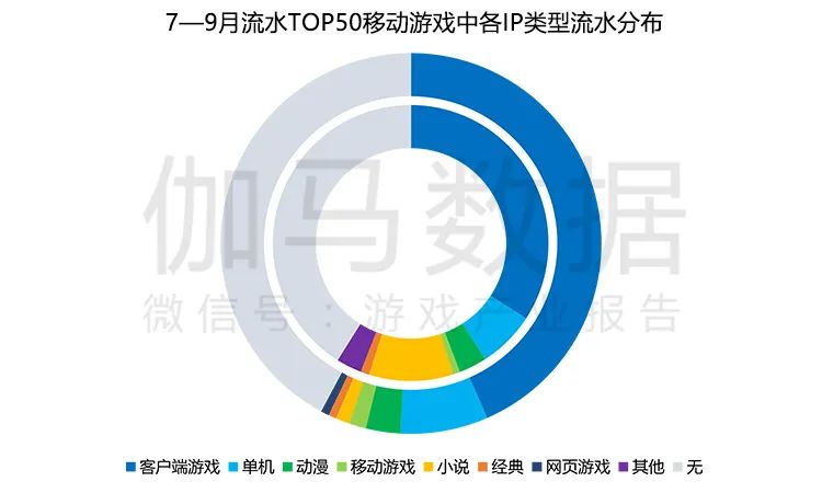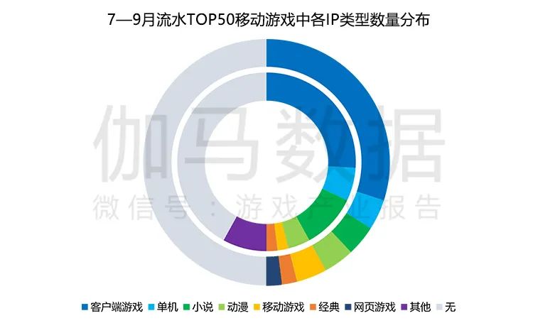 流水TOP50游戏IP分布:客户端游戏IP改编产品流水份额和数量均增长,较去年同期新增网页游戏IP改编产品