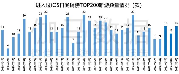 2022年9月,进入过iOS日畅销榜TOP200新游达16款,较上月增加4款,较去年同期增加2款。