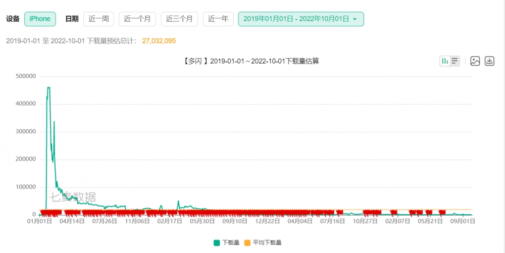 2019年1月1日至2022年10月1日,多闪iOS设备下载量统计 图片来源:七麦数据