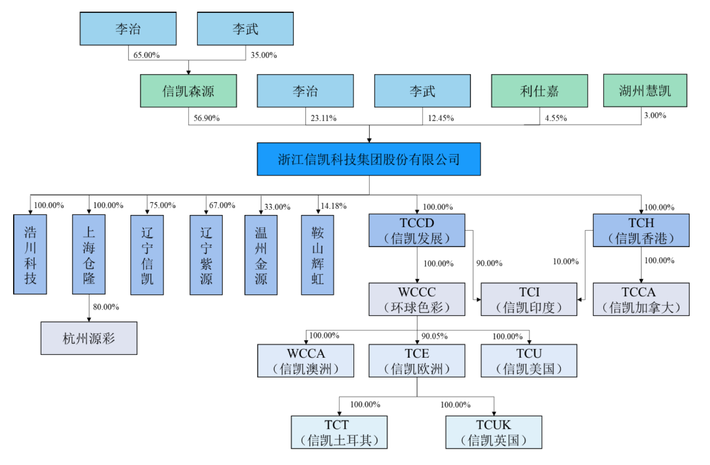 信凯科技的股权结构比较简单,信凯森源直接持有公司56.9%的股份,为公司控股股东;李治和李武系兄弟,其分别直接持有公司23.11%和12.45%的股份; 李治和李武分别持有信凯森源65%和35%的股权,通过控制信凯森源间接享有公司56.9%的表决权;李治通过担任利仕嘉执行事务合伙人,控制利仕嘉并间接享有公司4.55%的表决权,因此,李治和李武合计享有公司97%的表决权,为公司实际控制人。