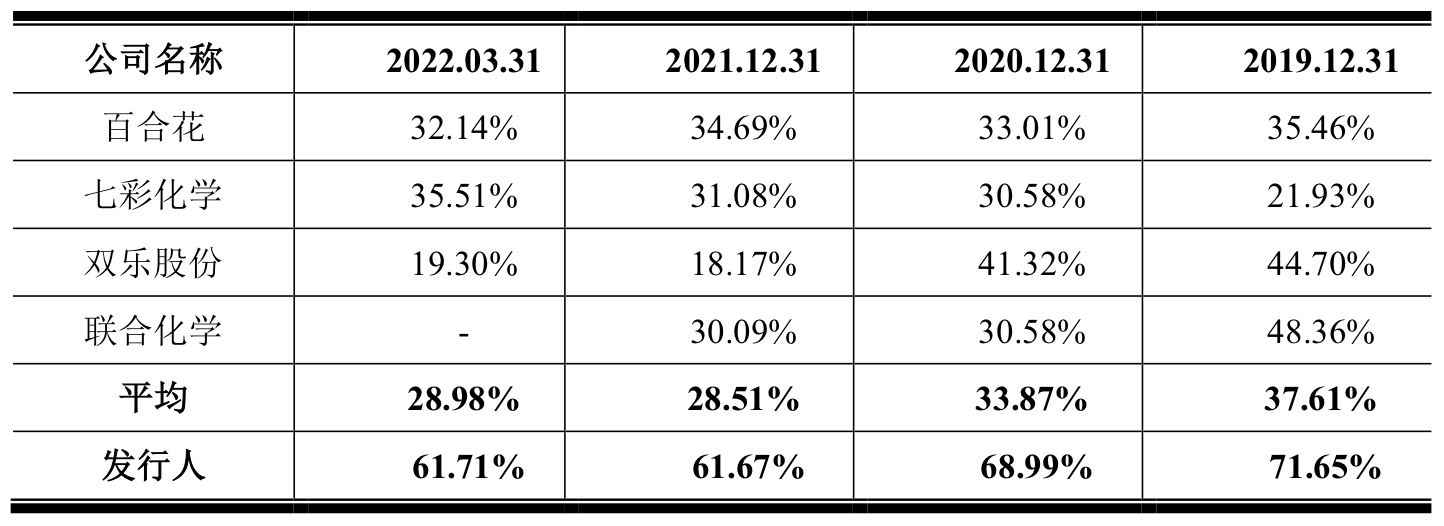 而“偿还银行贷款项目”,则是为了优化财务结构。数据显示,信凯科技的资产负债率达61.71%。同行公司如百合花(603823.SH)为32.14%,七彩化学(300758.SZ)为35.51%,双乐股份(301036.SZ)是19.3%,联合化学(301209.SZ)大约也在30%左右,都远低于信凯科技。2022年一季度末,信凯科技的短期借款8219.96万元,长期借款3391.15万元,一年内到期的非流动负债1714.01万元,合计1.33亿元。