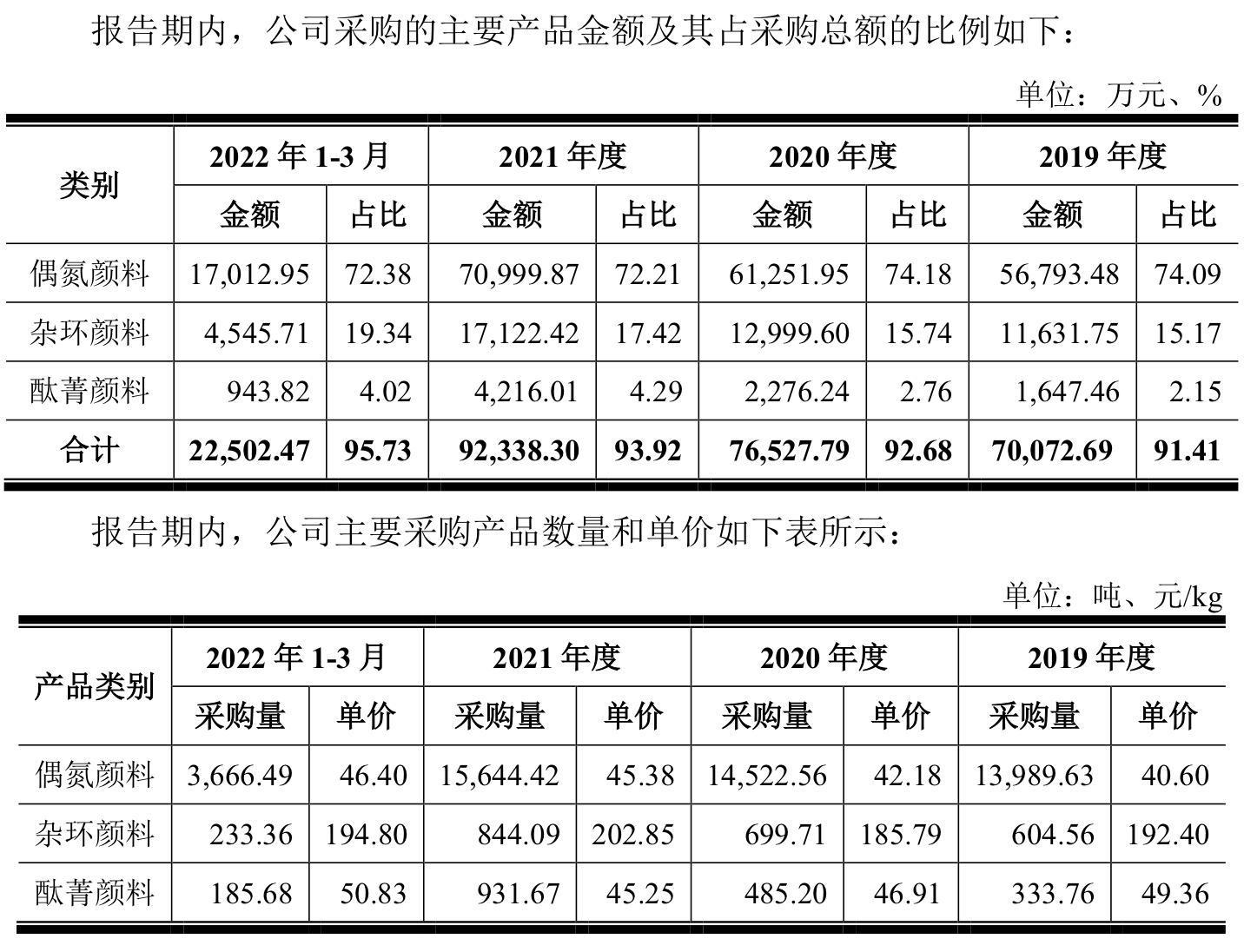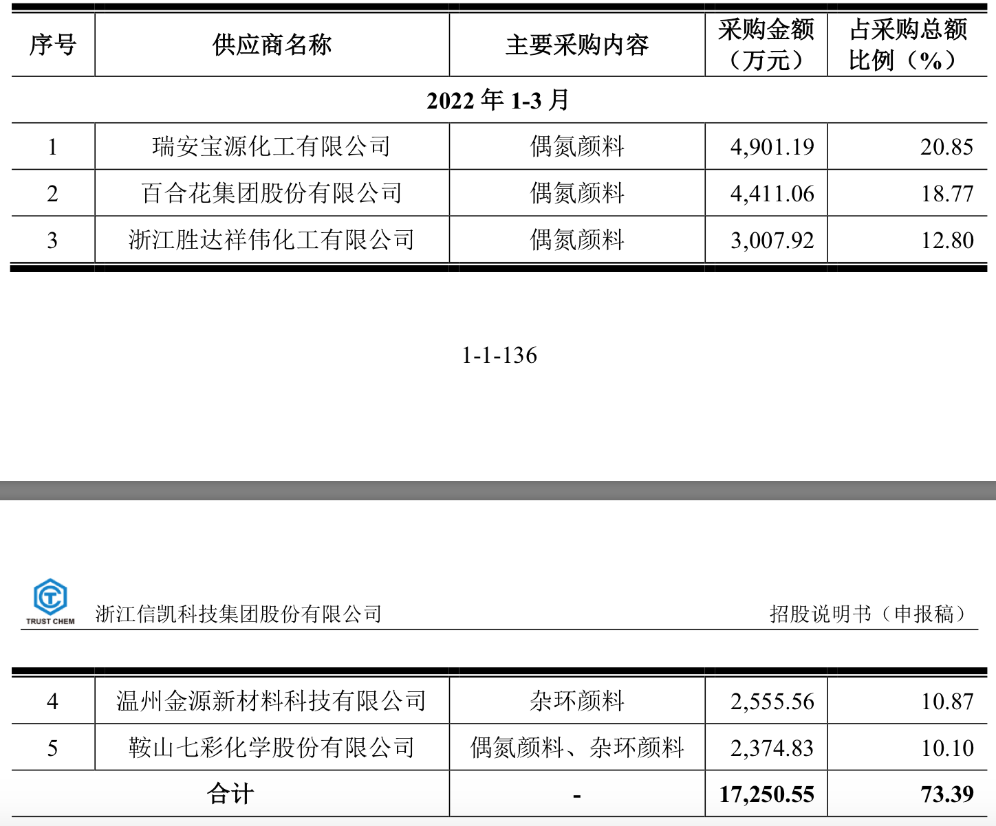 前文提及,信凯科技的主要产品为偶氮颜料、杂环颜料及酞菁颜料,占到2022年第一季度收入比例95.57%。然而,公司主要采购的产品也正是偶氮颜料、杂环颜料及酞菁颜料。信凯科技描述,报告期内主要让合格供应商按照要求进行生产,以适应产业链分工趋势、增强产品供应能力、丰富产品品类、扩大品牌知名度。公司对外采购的产品主要为供应商按公司产品质量要求生产的有机颜料成品。