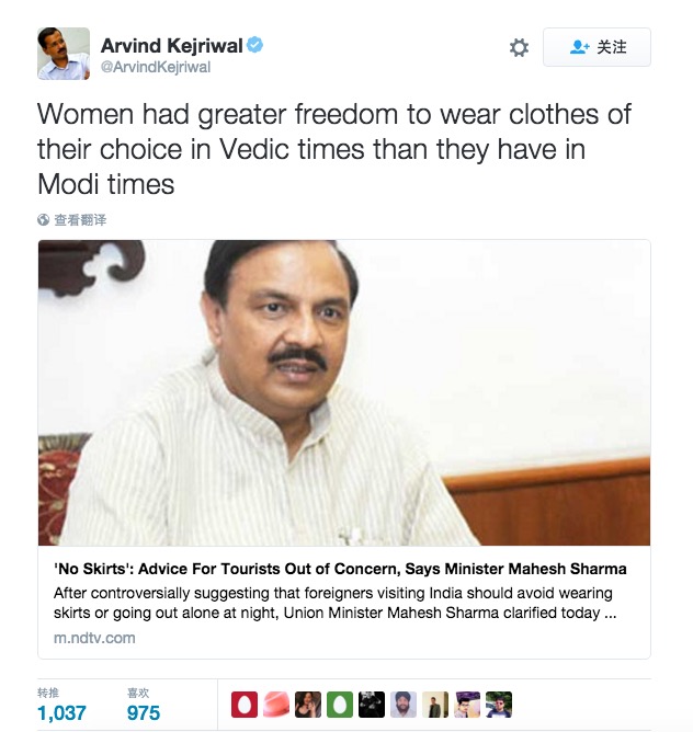 但是,沙玛这一言论在社交网络上的争议却并未停止。印度一名政府批评家Arvind Kejriwal在推特上发文称印度女性在莫迪时期享有的着装选择还没有古代吠陀时期(Vedic Times)自由。