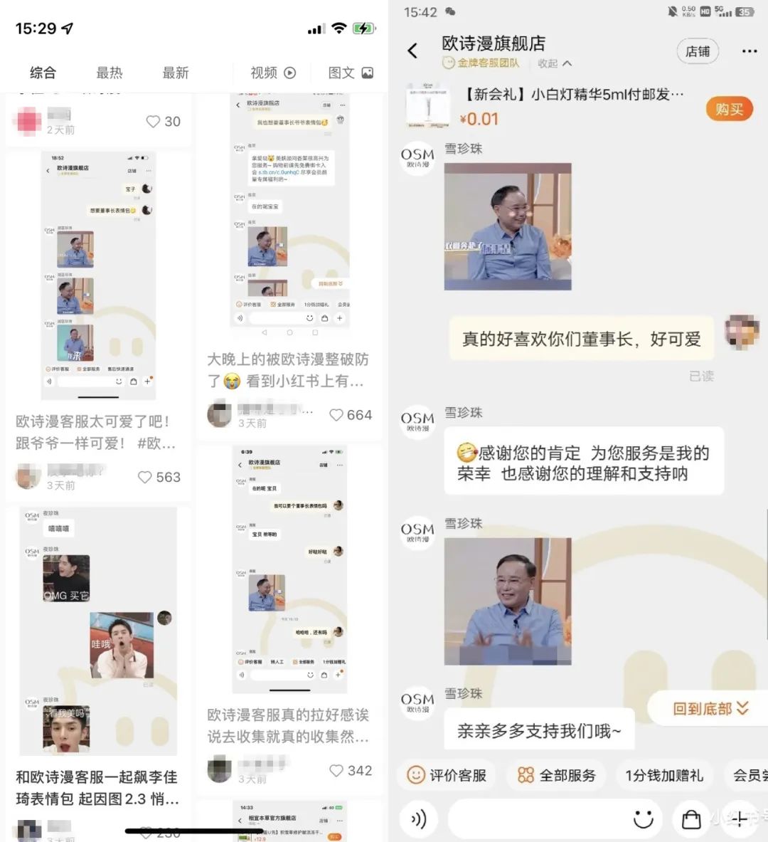 后续甚至有不少网友去到欧诗漫的天猫旗舰店,向客服“索要”欧诗漫爷爷的表情包。