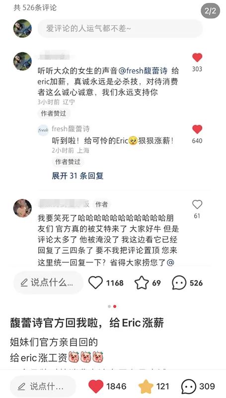 大家纷纷直呼“为了Eric我也得买Fresh!”“Eric太可怜了”“要给Eric升职加薪”。Fresh官方账号,也对此回应了用户的呼声。