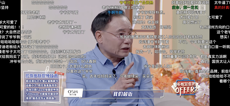 如欧诗漫董事局主席沈志荣,因其亲切、谦卑的形象,被网友尊称为“欧诗漫爷爷”。在不少网友在注意到今年已76岁沈志荣皮肤的状态后,直呼“董事长就是最好的代言人”。