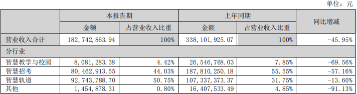 从营收构成来看,竞业达主要业务为智慧招考、智慧轨道,两项业务合计占档期总营收的约95%;而智慧教学与校园业务仅占当期总营收的4.42%,且营收同比大幅下滑近七成。