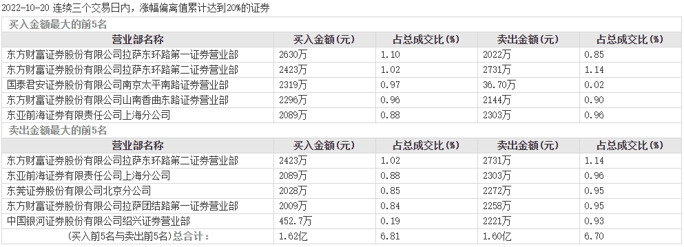 竞业达也连续多日登上龙虎榜。10月20日,公司因连续三个交易日内涨幅偏离值达20%而上榜。从累计买卖来看,“拉萨天团”——东方财富的多个营业厅占据了多个买卖席位。此外,“赵老哥”的常用席位中国银河证券股份有限公司绍兴证券营业部同样上榜。