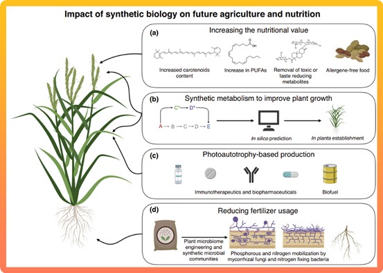 合成生物学在农业和食品领域具有极大的发挥空间。植物生长发育需要大量的营养元素,主要包括碳、氢、氧、氮、磷、钾、钙等,营养元素的不足会导致植物遭遇长势衰弱、病虫害频发、品质低下、产量减少等诸多问题,而合成生物学能够重建相关问题的解决方案。