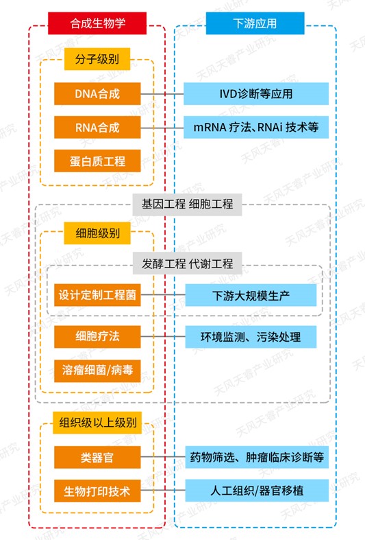 就合成的不同级别而言,合成生物学可以分为分子级别、亚细胞级别、细胞级别、组织乃至以上级别。分子级别的合成是改造一切生物体的基础,而细胞级别的合成,则是为目前在发酵(底盘细胞改造)、医学(各类免疫细胞疗法、溶瘤病毒)等各个领域的应用直接提供材料。