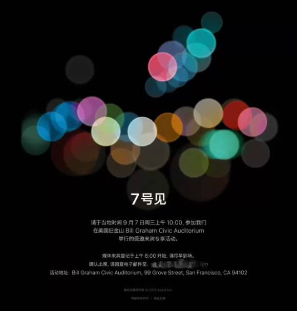 爱范儿(微信号:ifanr)收到了今年苹果秋季发布会的邀请函,苹果确定将在 9 月 7 日上午 10 点(北京时间 9 月 8 日凌晨一点)举行发布会。此次的发布会地点是旧金山的比尔·格雷厄姆市政礼堂。按照过往苹果发布会的经验,此次发布会上即将发布的新品,将可能有已经被曝光多次的新一代 iPhone,全新设计的 MacBook Pro 以及更强性能的 Apple Watch 2。