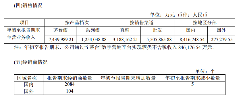 此外,前三季度直销渠道金额达到318.82亿元,比去年同期增长了超过一倍,而批发渠道则同比微降至550.59亿元;国内茅台经销商也减少了5个,最新为2084个,三季度也未增加新的经销商。