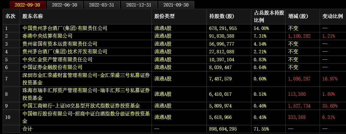 10月20日晚间,有投资者在上证E互动求证机构减持数据,贵州茅台回应称:“机构股东持股变化情况不实,公司《2022年第三季度报告》披露的公司前十名股东合计持股比例是71.54%,前十名股东之后还有大量的机构股东。”