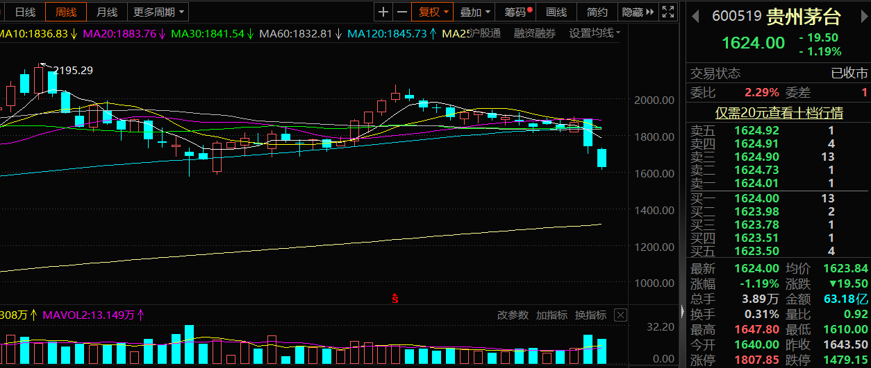 截至10月21日收盘,贵州茅台已经连续两周下跌,累计跌幅13.27%。考虑到这只股王乃上证50、沪深300指数第一权重的地位,其对整个市场价值中枢的下行,以及市场人气的影响都是巨大的。