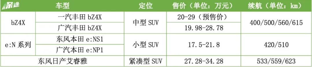 bZ4X是丰田bZ纯电专属系列的开山之作,e:N系列是本田纯电品牌e:N的第一款车型,艾睿雅则是集齐日产最新电气化技术的旗舰电动产品。