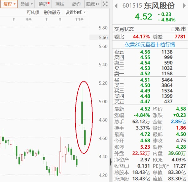 10月21日,东风股份(601515.SH)每股收于4.52元,跌4.84%;继上一个交易日高开低走的“长阴线”之后,再收一根阴线;10月19日所收的“一字涨停板”已被大幅回吐。