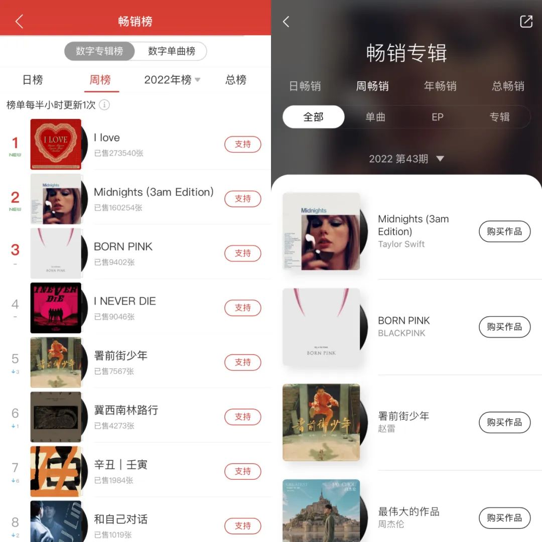 “霉霉”的号召力自然无需赘言,新专辑上线仅40分钟《Midnights》在QQ音乐、网易云两家平台的销量就纷纷突破了10万张。截至当晚9点,在两家平台纷纷登上专辑畅销周榜,全网销量超35万张,销售额破1200万元。