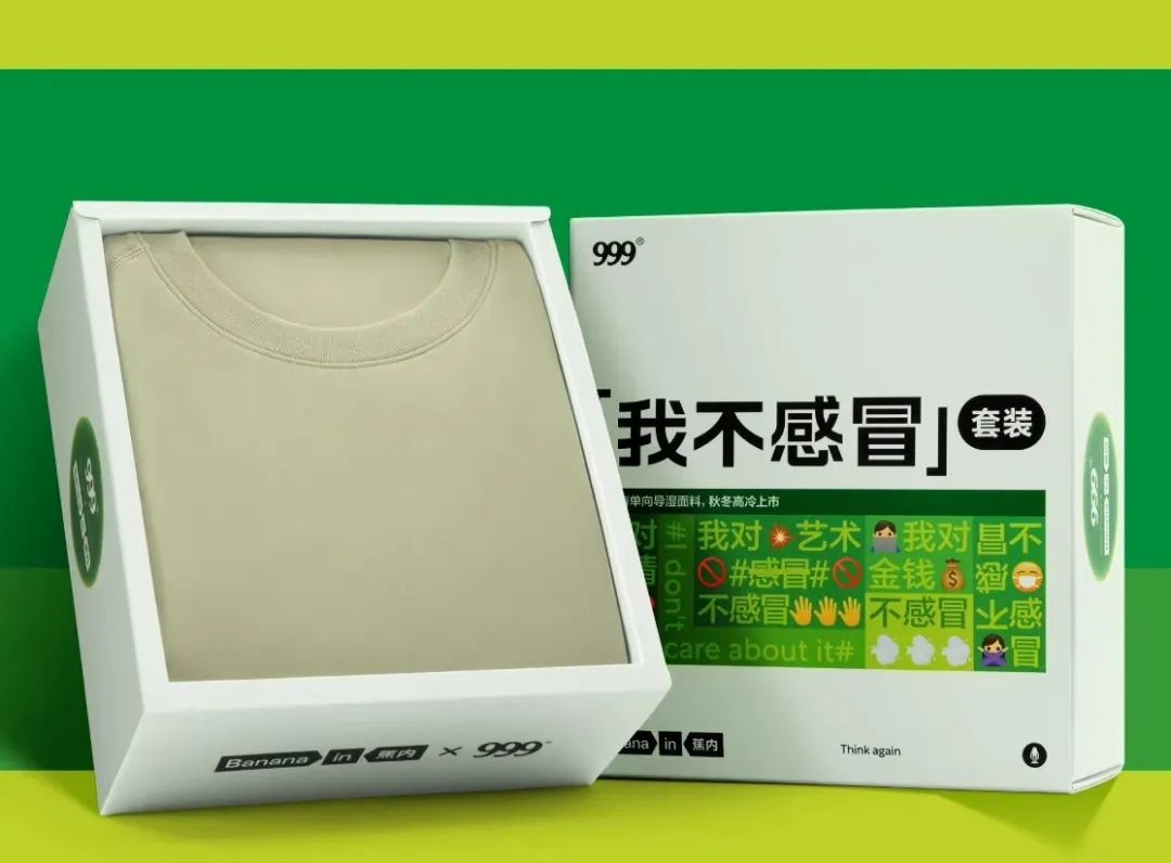 身为“跨界鬼才”的999感冒灵,此前早已入局过服饰赛道,曾经推出暖心秋裤等产品。此次联名内衣品牌「蕉内」,推出“我不感冒”套装,既具备实用性,又兼具趣味性,堪称一次成功的营销策略。