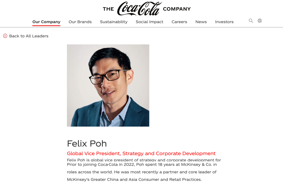 在全球层面,可口可乐公司一下新增了三位“VP”(副总裁),其中一位是原麦肯锡驻上海分公司全球董事合伙人蒲仁伟(Felix Poh)。