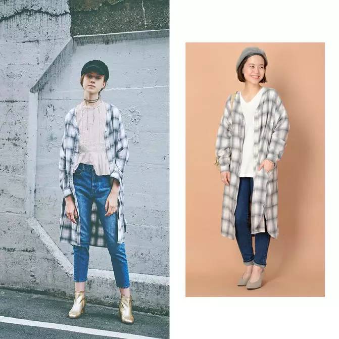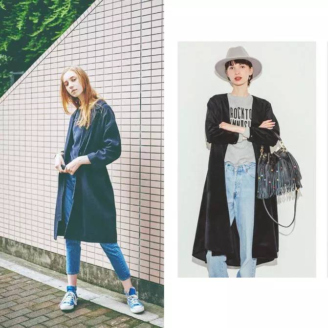 一身单宁里面搭件长衬衣开衫的搭配法大家可以学起来。