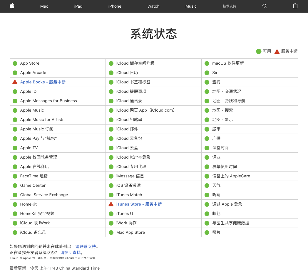 苹果公司系统状态页面显示,截至目前,iTunes Store、Apple Books均处于服务中断状态。
