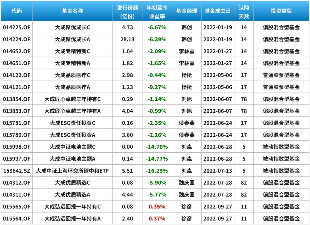 Wind数据显示,2022年年内大成基金共有近20只基金产品认购、成立,其中包括7只主动权益基金产品,以及2只被动指数产品(A/C两类合并)。