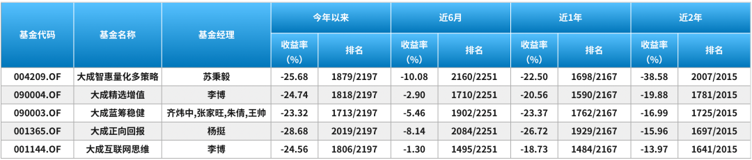 《全球财说》发现,将大成基金所有主动权益类产品按照近2年业绩排列,上述两位基金经理所管产品均出现在收益倒数五名之列,在全行业同类排名中位居于末位。