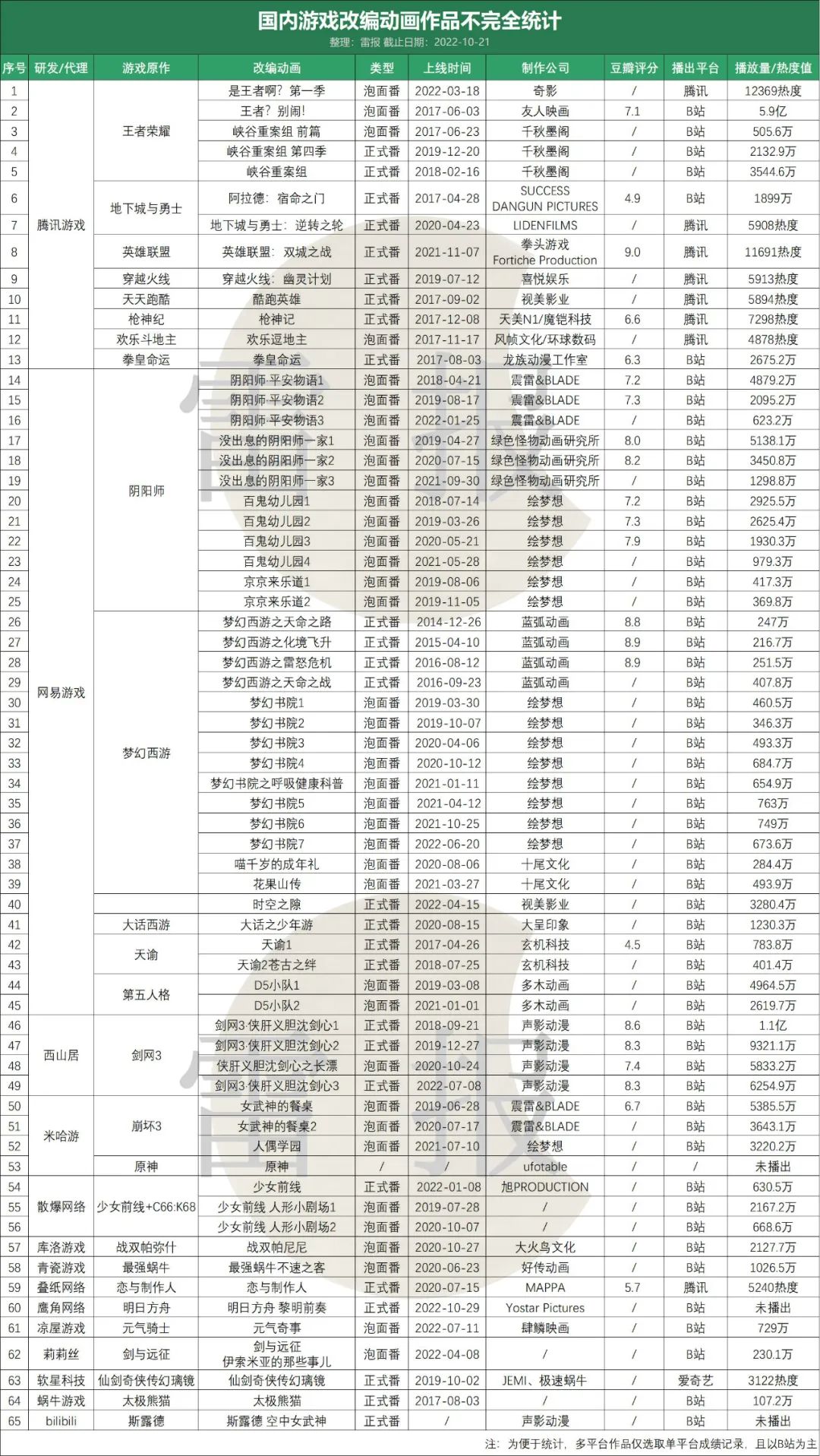 65部国产游戏改编动画网易占一半、泡面番达6成,出圈爆款/口碑神作寥寥