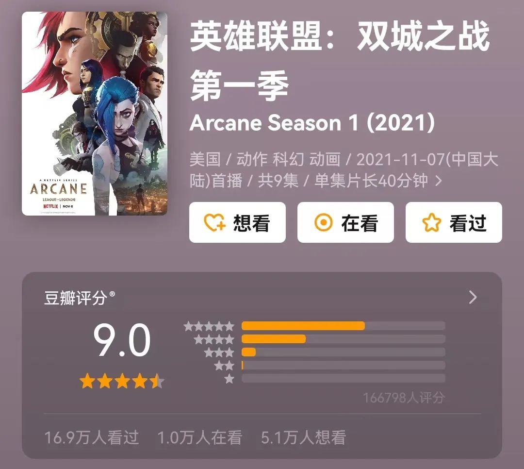四部作品中,抛开粉丝的滤镜,真正算得上具有影响力的口碑神作的或许仅有《英雄联盟:双城之战》一部,且实际上,动画在制作上由拳头公司和位于法国巴黎的动画工作室Fortiche Production负责,与“国产”的关系几乎为零。