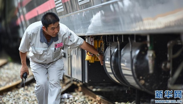 8月29日,在泰国曼谷华兰蓬火车站,中国中车长春轨道客运股份有限公司海外售后服务部工程师李树平在检查一列即将进行试运行的新列车。泰国国家铁路局29日在曼谷火车站举行新客运列车试运营仪式。这批产自中国的新列车投入运行后将极大提高泰国火车的舒适度与现代化程度,预计新列车将于10月正式投入曼谷-清迈线运营。 新华社记者李芒茫摄
