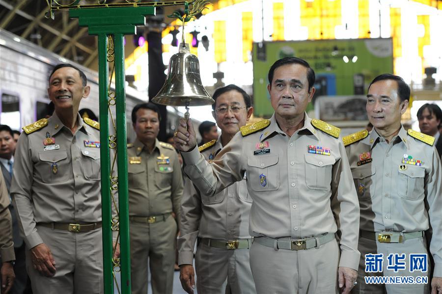 8月29日,在泰国曼谷华兰蓬火车站,泰国总理巴育(前)摇铃宣布新客车试运行仪式开始。泰国国家铁路局29日在曼谷火车站举行新客运列车试运营仪式。这批产自中国的新列车投入运行后将极大提高泰国火车的舒适度与现代化程度,预计新列车将于10月正式投入曼谷-清迈线运营。 新华社发(拉亨摄)