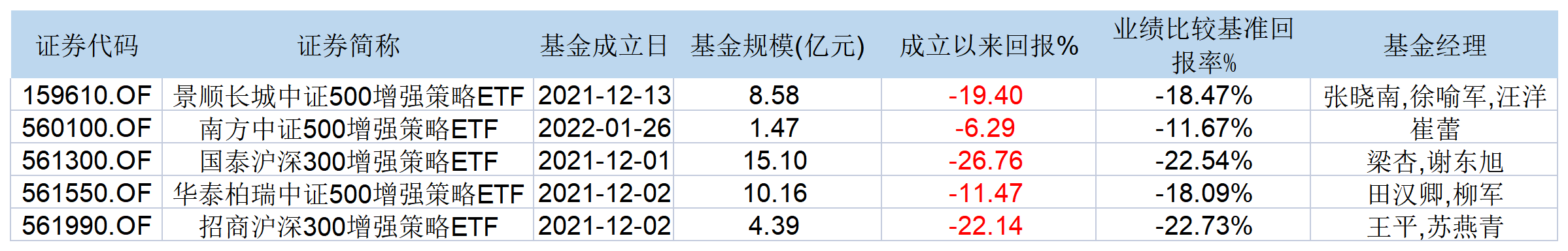 去年12月,首批5只指数增强ETF获批并成立,分别是景顺长城中证500指增ETF、南方中证500指增ETF、国泰沪深300指增ETF、华泰柏瑞中证500指增ETF和招商沪深300指增ETF。