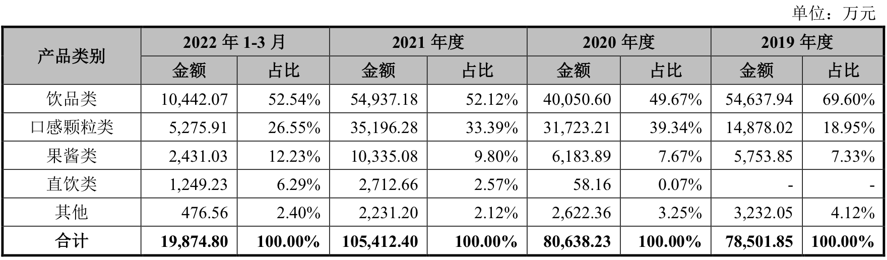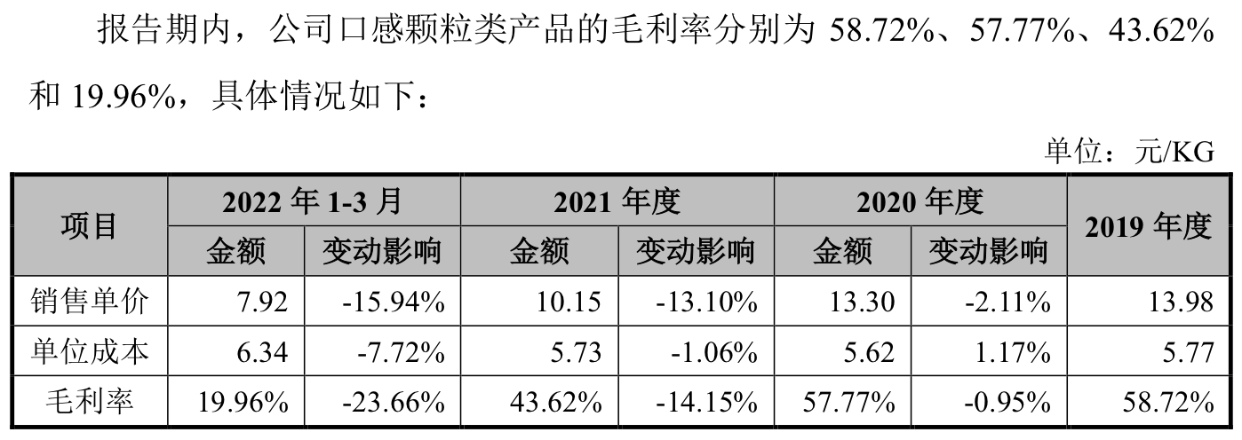 而2022年1-3月公司主营业务毛利率为24.46%,相较上年的33.67%下降9.21%,其中产品收入占比变动导致主营业务毛利率下降1.38%,各产品毛利率变动导致主营业务毛利率下降7.83%。具体而言,2022年1-3月口感颗粒类产品销售价格下降,导致其销售收入占比由上年的33.39%下跌至26.55%,毛利率由上年的43.62%下降至19.96%,从而导致主营业务毛利率下降9.27%,为主营业务毛利率变动最主要的原因。