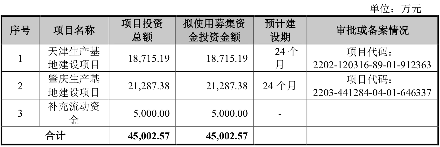 按照公司的说法,随着业务的发展,现有产能已经不能及时满足客户日益增长的订单需求,尤其在销售旺季满负荷生产。而此番,公司计划募资约4.5亿元,投入到“天津生产基地建设项目”、“肇庆生产基地建设项目”、“补充流动资金”,投入金额分别为1.87亿元、2.13亿元、5000万元。