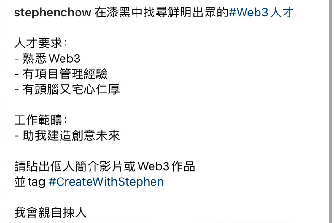 “在漆黑中找寻鲜明出众的Web3人才。”就像周星驰在招人公告里提及的这句话,在过去一年里,以去中心化为核心的Web 3.0概念犹如黑暗中的萤火一般,给诸多行业带来了一抹新的亮色。