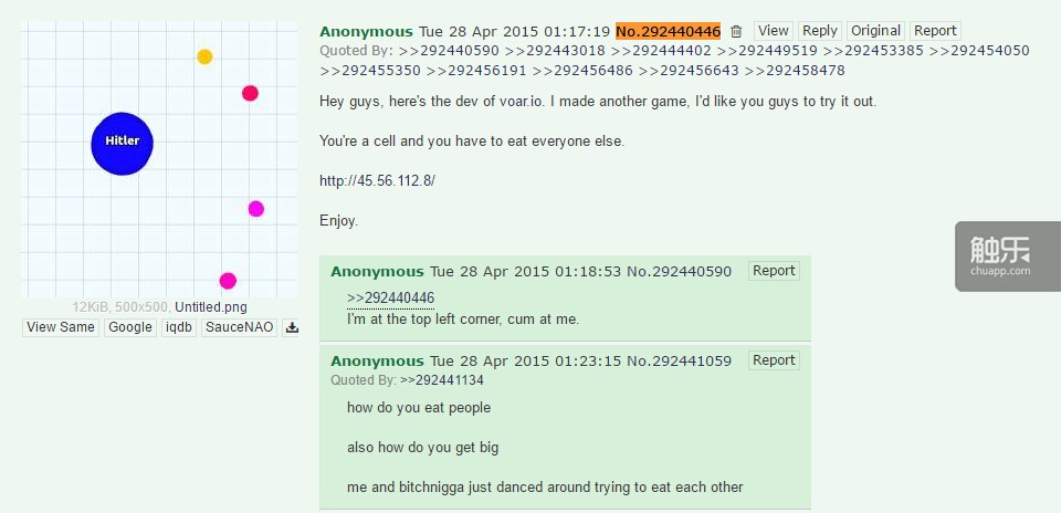 2015年4月28日,“No.292440446” 在4chan发布了《Agar.io》。