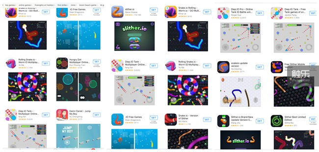 (App Store上满坑满谷的《Slither.io》山寨游戏)