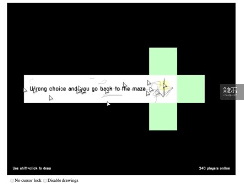 每个玩家控制一个光标进行闯关,并能看见其他所有玩家控制的光标。在上图的关卡中,需要三选一,只有一个正确的方块通向下一关。你可以注意到很多人在画线——有些人是二周目,他们在尝试提示后来人正确的路径。有的人则是在故意误导。